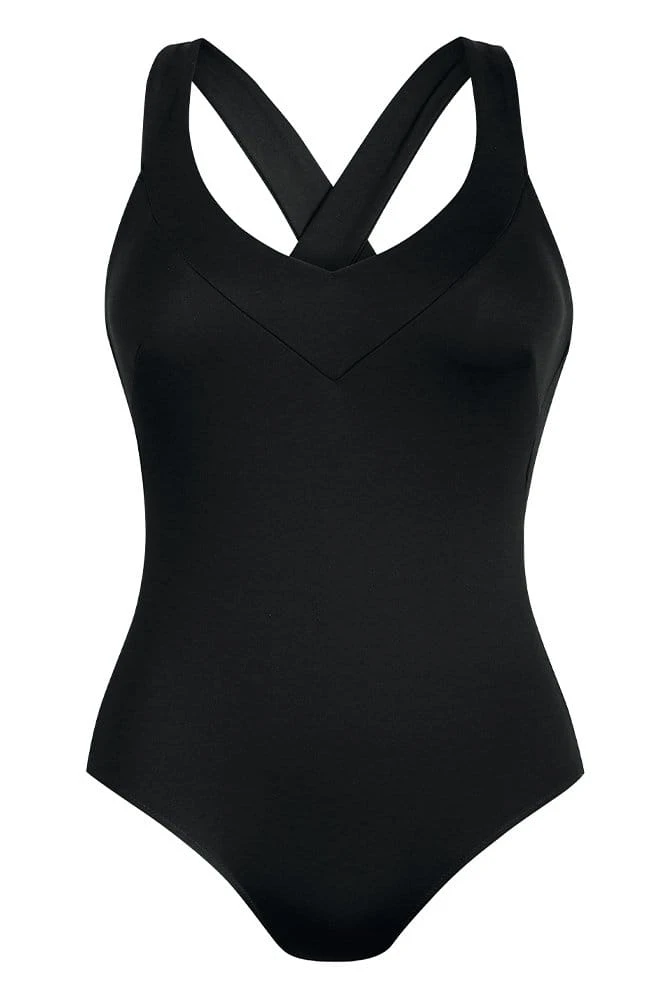 Die breiten, im Rücken über Kreuz gelegten, Träger sorgen für komfortablen Halt und sind noch dazu ein echter Blickfang. In edlem Schwarz ist der Einteiler der perfekte Begleiter für die Poolparty oder eine ausgiebige Schwimmsession.