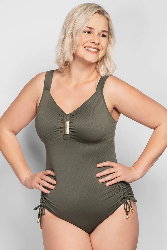 Der attraktive Badeanzug trägt sich angenehm komfortabel und überzeugt durch eine funktionale Schnittführung sowie raffinierte Details für große Größen. Ihr Dekolleté wird durch leichte Raffungen hübsch betont und verziert mit einem Schmuckdetail in Silber raffiniert in Szene gesetzt.