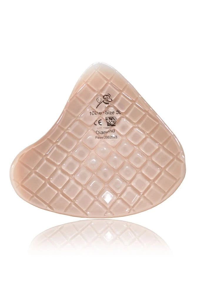 Einzigartig bei der Diamond-Serie ist die innovative Rückseite der asymmetrischen Brustprothese 10218. Maßgebend ist das funktionale Karomuster, das einen besonders gut lüftenden Effekt bewirkt. Die Diamondstruktur der ABC-Vollprothese sorgt für einen begünstigten Luftaustausch und erzielt damit einen Abkühl- und Trocknungseffekt.