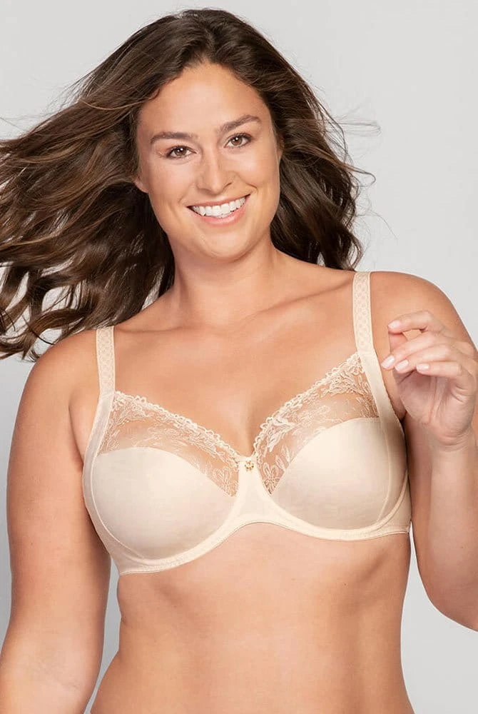 Feminine Stickerei in perfekter Harmonie mit funktionalen Eigenschaften. Das ist BH Jasmin für große Cup Größen von Ulla. Das raffiniert geschnittene Cup wurde durch vier Teilungsnähte besonders an die Form der Brust angepasst. In der Unterschale ist hochwertige feste Wirkware eingearbeitet, so vermittelt BH Jasmin extra viel Halt und Stütze im Cup. Die florale Stickerei ist definitiv das, was diesen BH ausmacht, außerdem überzeugt sie durch einen elastischen Abschluss am Dekolleté. Es zeichnet sich nichts ab. Wunderschöne verstellbare Jacquard-Träger werden mit zunehmender Größe breiter. Perfekt ergänzt werden die BHs der Serie Jasmin durch die beiden passenden Slips mit hohem oder mittelhohem Bund und den exklusiven Body.