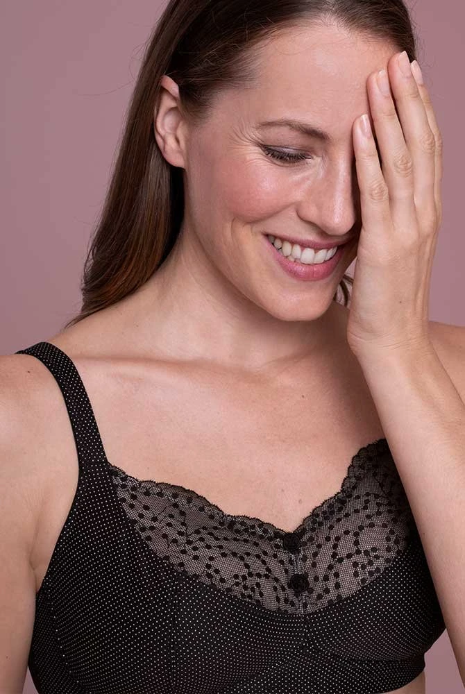 Verträumtes Pünktchen-Design à la française: Der Spezial-BH Orely mit diskreten Prothesentaschen beidseits zeigt eine wunderschöne Spitze mit Mini-Dot-Print, kontrastiert mit einer verspielten Pünktchen-Stickerei und kleinen Zierknöpfen in der vorderen Mitte. Durch die tiefe Platzierung der blickdicht unterlegten Stickerei im Dekolleté deutet sich eine verführerische Balconnette-Optik an. Bequeme Komfortträger entlasten mit einer weichen Schaumfüllung die Schultern und den Nackenbereich. Qualitätsmarke Anita Care überzeugt mit Design der Extraklasse. Durch das dreigeteilte Cup sitzt der Prothesen BH Orely 5782X sicher und angenehm. Die beidseits eingearbeiteten Prothesentaschen bestehen aus weichem Material und liegen angenehm auf der Haut. Der bügellose Prothesen BH Orely von Anita Care mit Prothesentaschen überzeugt durch hochwertiges Material und perfektem Schnitt. Dank seiner luftdurchlässigen Struktur sorgt er für einen spürbaren Klima-Komfort.