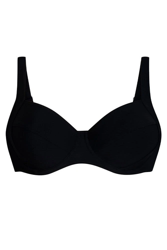 Klassisch elegant in Schwarz überzeugt Bikini Top Sibel vor allem in großen Größen. Die raffinierte Schnittführung der Bügel-Cups sorgt nicht nur für wunderbaren Halt sondern hebt Ihre Brust auch leicht und stütz bei jeder Bewegung. Komfortable verstellbare Träger optimieren die Passform. Das spezielle Brustfutter und flexible Stäbchen an den Seiten sorgen für besonders guten Sitz. Ergänzt wird Bikini Oberteil Sibel durch eine große Auswahl an passenden Badehosen.