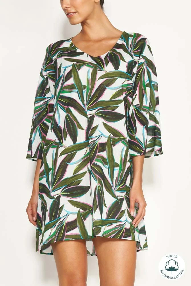 Aus fließendem leichten Baumwollstoff mit wunderschönem Blätterdesign überzeugt Tunika Green Leaves selbst im heißesten Sommer als Begleiterin für Ihren Urlaub. Leicht und luftig fällt der lockere, in herrlichen Grüntönen gemusterte Stoff schön schwingend und umspielt schmeichelhaft Ihren Körper. Die Tunika von Xanadu Beach endet in der Länge kurz über dem Knie. Ein modischer V-Ausschnitt akzentuiert Ihr Dekolleté. Ob als Strandtunika oder leichtes Kleid für heiße Sommertage zu Hause oder im Garten – mit unserer Tunika in Top Qualität sind Sie perfekt gekleidet und bestens vorbereitet für sonnige Sommertage.